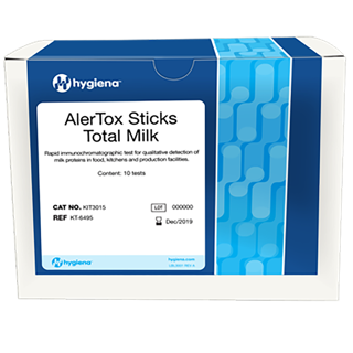 AlerTox Sticks Total Milk es una prueba inmunocromatográfica rápida y fácil de usar para la detección cualitativa de caseína y beta-lactoglobulina en alimentos y superficies. Este kit de detección no presenta reacción cruzada con otras proteínas de la leche y está diseñado para su uso con materias primas, productos finales y superficies.
